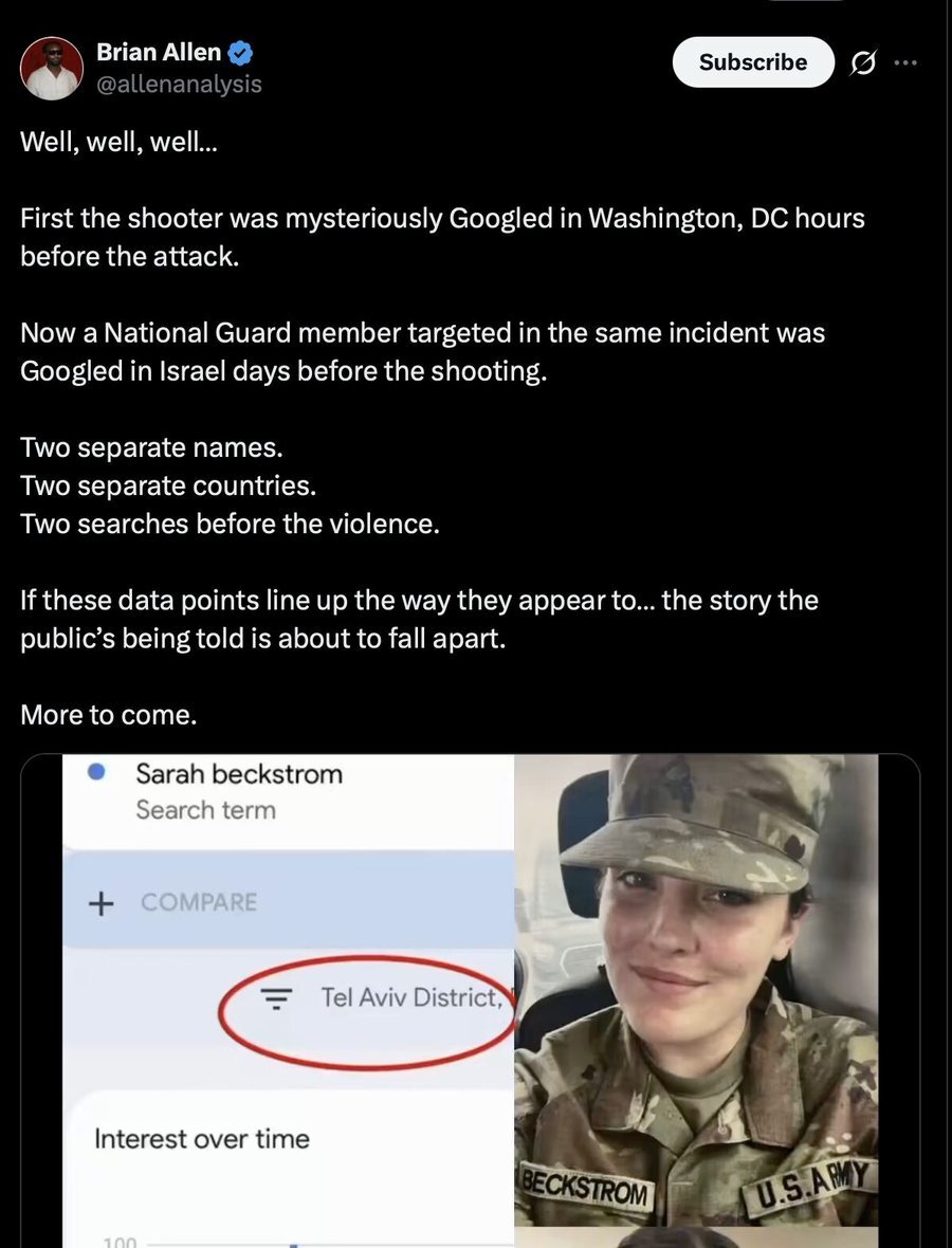Dva dana kasnije, 28. novembra 2025. godine, korisnik po imenu Brian Allen objavio je na X-u tvrdeći da je putem Google Trendsa došao do neobičnog otkrića: ime jedne od žrtava, Sarah Beckstrom, pretraživano je na internetu desetine puta nekoliko dana prije napada u SAD-u.