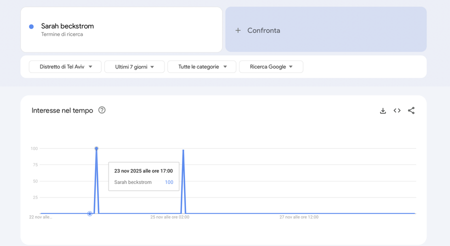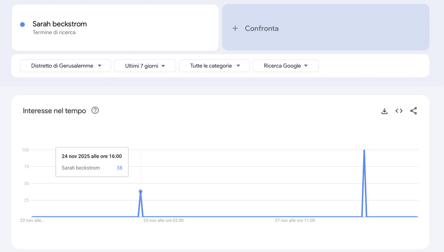 Pucnjava u Washingtonu dogodila se u srijedu, 26. novembra. Prema podacima Google Trendsa, pretrage za pojam "Sarah Beckstrom" dva puta su dostigle vrhunac u okrugu Tel Aviv, na dan kada su dva policajca upucana i tri dana ranije, 23. novembra 2025. godine.