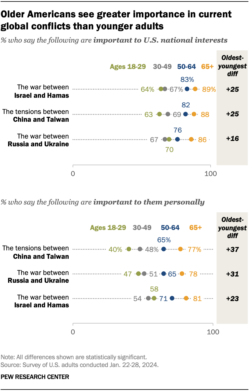 Za sva tri sukoba zahvaćena u istraživanju, stariji Amerikanci češće nego mlađi Amerikanci smatraju da su važni i za nacionalne interese SAD-a i za njih lično.