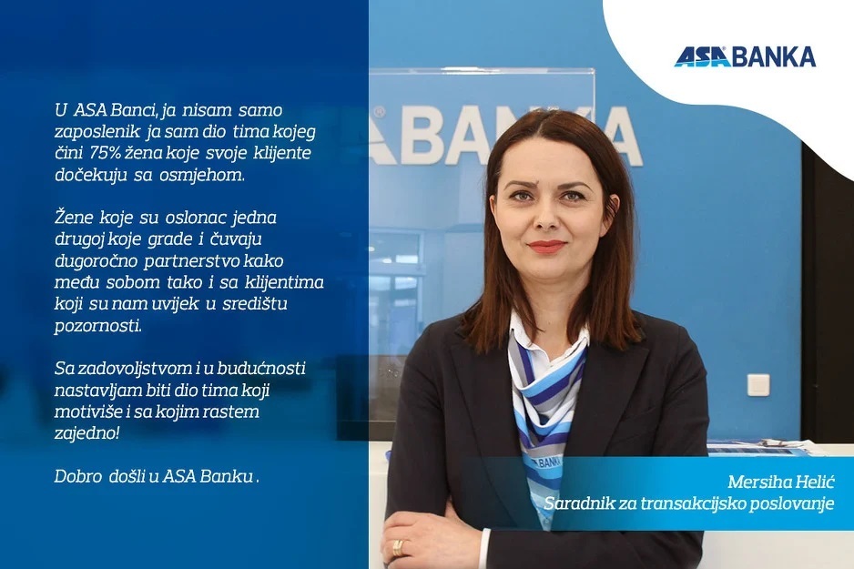 "Svjesni smo činjenice da su inkluzija i rodna ravnopravnost značajni faktori održivog poslovanja. Svojim djelovanjem, koje uključuje integritet, transparentnost i otvorenost, proaktivnost, timski rad i istrajnost, gradimo zdravo radno okruženje. Kontinuirano smo posvećeni uspostavljanju kvalitetnog odnosa s klijentima i jačanju domaćeg tržišta", ističe Hanifa Vuković, direktorica Sektora za upravljanje ljudskim resursima ASA Banke.