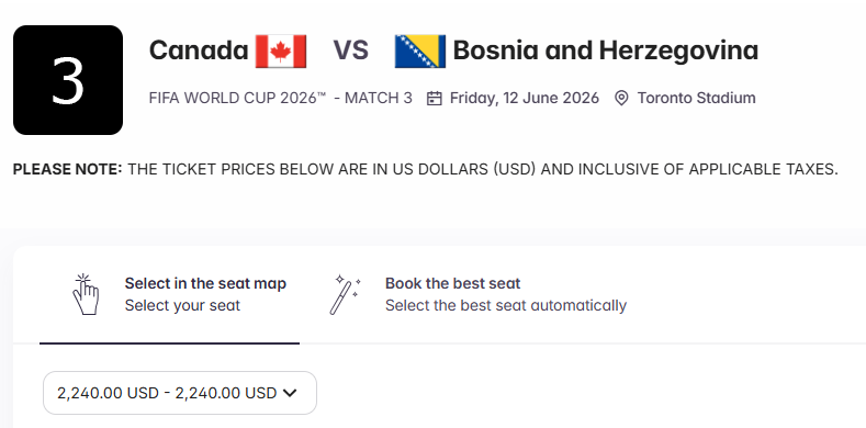 U trenutnoj ponudi FIFA-e nalazi se jedna utakmica naše reprezentacije. Za prvi meč Bosne i Hercegovine na SP protiv Kanade 12. juna u Torontu dostupne su karte kategorije "1" po cijeni od 2.240 dolara, dok su ranije koštale 2.170 dolara.