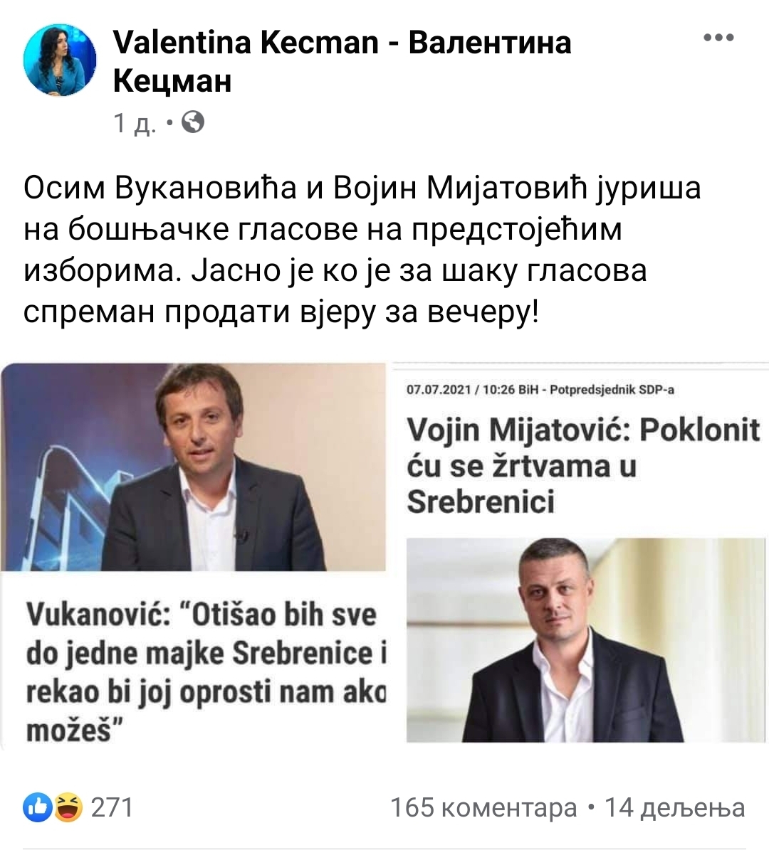 Također, putem društvenih mreźa se obračunava, dosta grubo, sa političkim protivnicama. Tako je za Nebojšu Vukanovića i Vojina Mijatovića pisala da su "prodali vjeru za večeru" jer se "bore za muslimanske glasove".