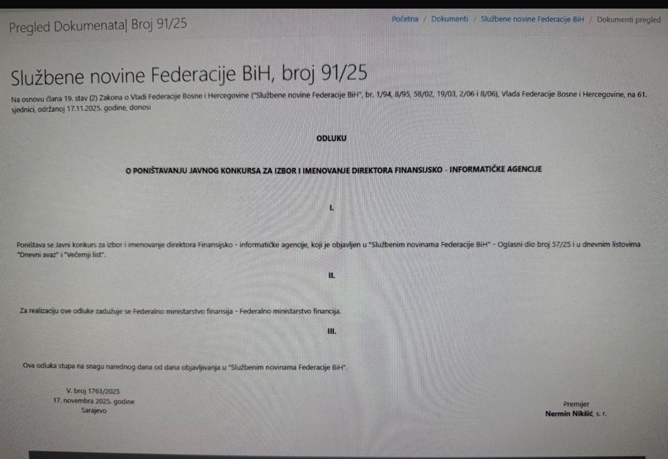 Na sjednici Vlade Federacije BiH održanoj , 17.11. 2025. godine poništen je javni konkursa za izbor direktora Finansijsko-informatičke agencije (FIA). Prema informacijama do kojih je etto.ba došao, takav potez nije imao nikakav pravni osnov.