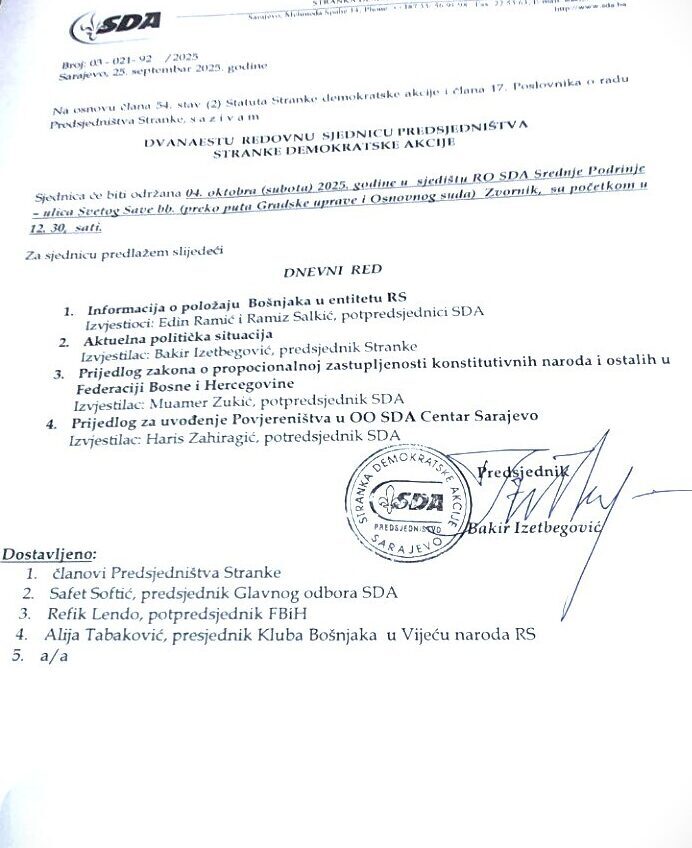 Dokument je potpisao predsjednik SDA Bakir Izetbegović, a poziv je dostavljen članovima Predsjedništva stranke, Safetu Softiću, predsjedniku Glavnog odbora SDA, Refiku Lendi, potpredsjedniku Federacije BiH, te Aliji Tabakoviću, predsjedniku Kluba Bošnjaka u Vijeću naroda RS.