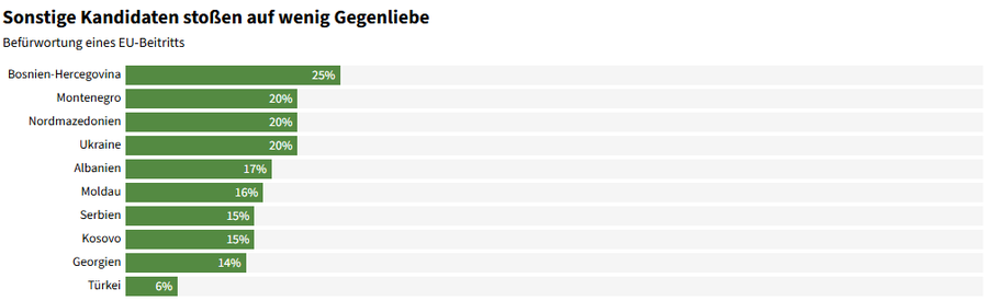 Iako bi ove dvije nordijske zemlje bile dobrodošle, velika većina u Austriji odbacuje članstvo istočnoevropskih zemalja. Samo 25% ispitanika pozitivno je raspoloženo prema Bosni i Hercegovini, koja je na vrhu liste s niskom podrškom. Crna Gora, Sjeverna Makedonija i Ukrajina dostižu samo 20%, Albanija 17%, Moldavija 16%, dok Srbija i Kosovo samo 15%.