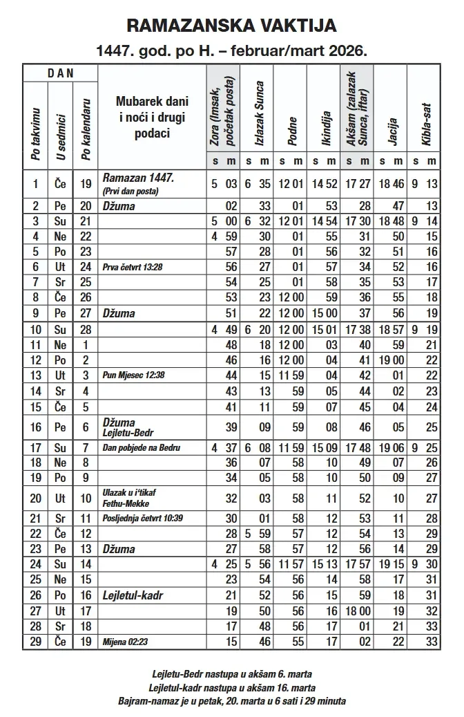 U skladu sa odlukom Islamske zajednice u Bosni i Hercegovini, Ramazan 1447. hidžretske godine počinje četvrtak, 19. februara 2026. godine, što znači da će muslimani u Bosna i Hercegovina prvu teraviju klanjati u srijedu, dok će prvi dan posta biti u četvrtak.