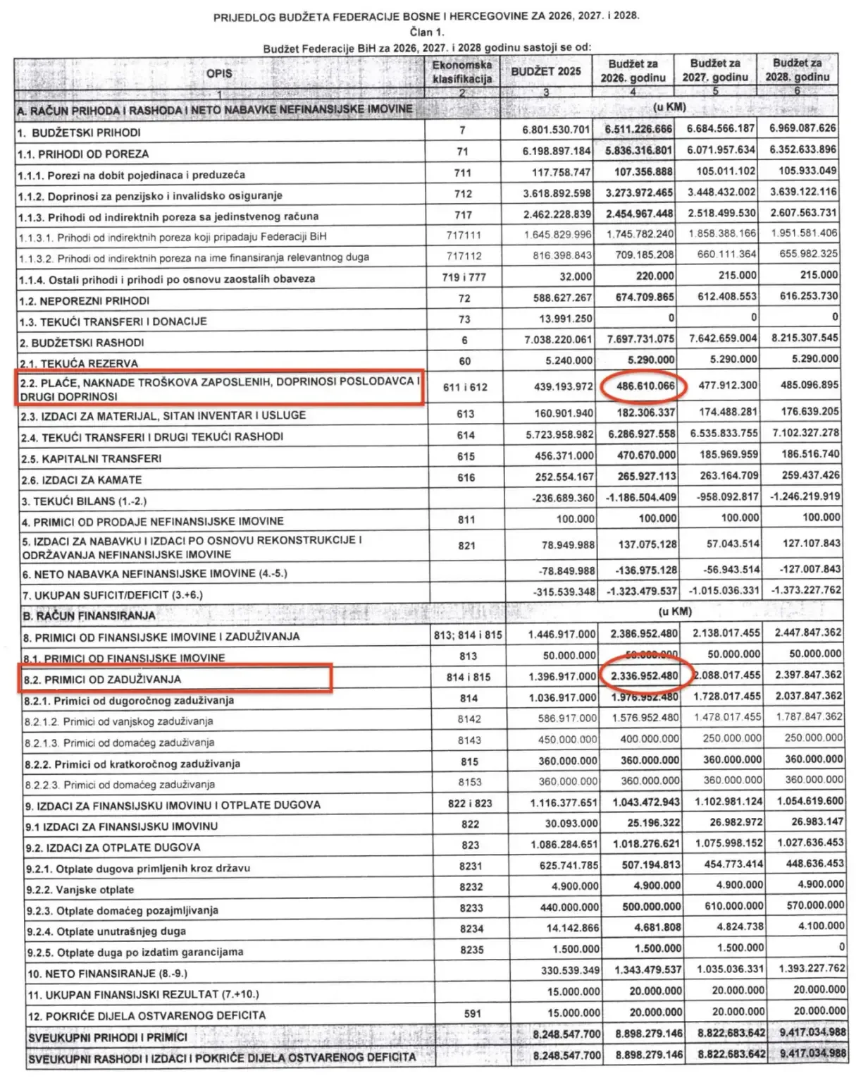 Kako bi se pokrio enormni deficit, federalna vlast planira zaduženje u rekordnom iznosu od 2,3 milijarde KM, što je gotovo milijardu više nego u 2025. godini. Od tog iznosa, 1,5 milijardi KM otpada na vanjsko zaduženje, dok se ostatak odnosi na unutrašnje kreditne aranžmane. U poređenju s prošlogodišnjim primicima od zaduživanja, koji su iznosili 1,39 milijardi KM, ovakav rast predstavlja skok od čak 940 miliona KM.