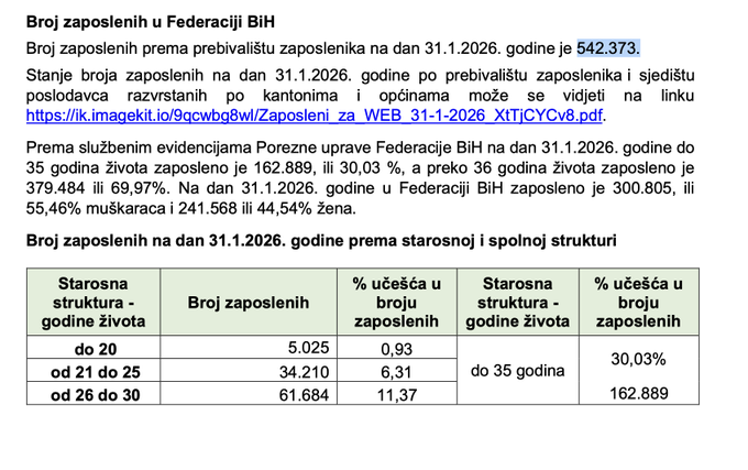Situacija postaje još zabrinjavajuća kada se uporede podaci s krajem 2023. godine. Naime, 31. decembra 2023. godine u Federaciji BiH bilo je zaposleno 544.345 osoba, što znači da je tada bilo gotovo 2.000 više zaposlenih nego danas. Također, već 31. januara 2024. godine broj zaposlenih iznosio je 541.668, što dodatno potvrđuje oscilacije i nestabilnost na tržištu rada.
