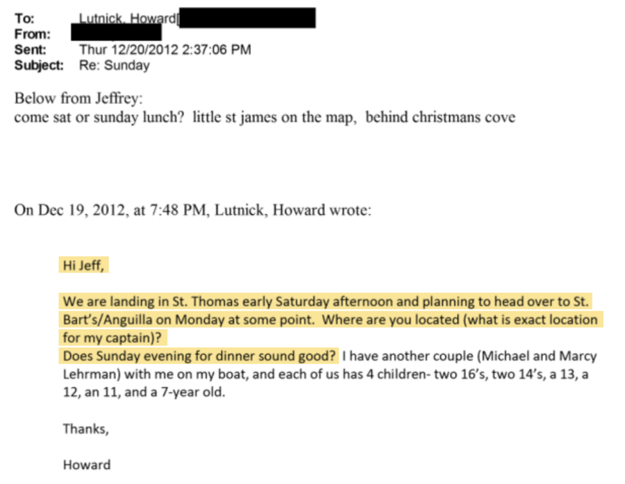 U e-poruci iz decembra 2012. godine, Lutnickova supruga Alison je dan prije posjete napisala Epsteinovom asistentu: "Radujemo se što ćemo vas posjetiti" i "Bilo bi nam jako drago da se nađemo na ručku." U drugoj e-poruci, poslanoj šifriranom primaocu nekoliko dana ranije, Lutnick piše: "Zdravo Jeff... Šta kažeš na nedjelju navečer za večeru?"