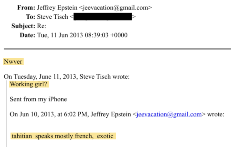 U drugim e-mailovima, Epstein kaže Tisch da ima "dar" za nju i opisuje ženu koju bi mu predstavio kao "Tahićanku koja uglavnom govori francuski i egzotična je". U izjavi za CNN, Tisch je rekla da je imala "kratku vezu" s Epsteinom, dodajući da "nije prihvatila nijedan njegov poziv i nikada nije bila na njegovom ostrvu".