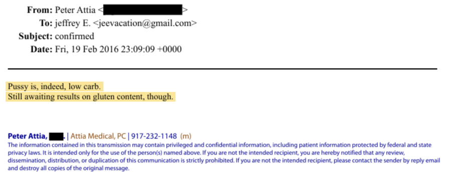 Prema nedavno objavljenim dokumentima, influencer protiv starenja i saradnik CBS Newsa Peter Attia razmijenio je stotine e-mailova s Epsteinom, uključujući i lascivne komentare. U e-mailovima je napisao da je njegovo prijateljstvo s Epsteinom nešto što može javno podijeliti i uključivao je raspravu o članku Miami Heralda iz 2018. godine u kojem su identificirane neke od Epsteinovih žrtava.