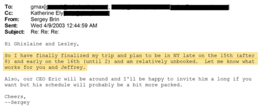 Također se dopisivao s Ghislaine Maxwell, koja je u aprilu 2003. napisala Brinu: „Večere u Jeffrey'su su uvijek ugodne, opuštene i neformalne“ i „Radujem se što ću vas vidjeti.“ U drugom e-mailu, Maxwell je pozvao Brina da ga prati na projekciju filma u New Yorku. U e-mailovima nema naznaka o bilo kakvom nezakonitom djelu.
