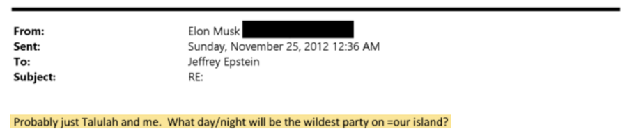 U drugom e-mailu, u decembru te godine, napisao je: „Zaista želim da se zabavljam u St. Bartsu ili negdje i da se opustim“, dodajući da je „mirno ostrvsko iskustvo“ suprotno od onoga što on želi. Musk je odgovorio na objavu na X u januaru, priznajući da bi se e-mailovi mogli koristiti za „kaljanje mog imena“, ali je rekao da je više zabrinut zbog krivičnog gonjenja „onih koji su počinili teške zločine sa Epsteinom“.