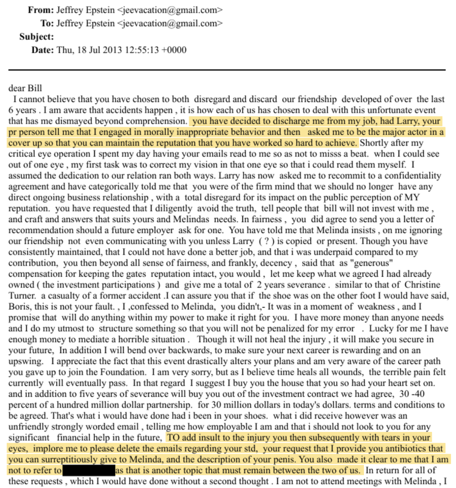 Dva e-maila od 18. jula 2013. godine izgleda da je napisao Epstein, ali nije jasno da li su autentični ili da li su ikada poslani suosnivaču Microsofta Billu Gatesu. Jedan je napisan kao pismo ostavke od Fondacije Billa i Melinde Gates i žali se da je morala obezbijediti lijekove za Gatesa "kako bi se nosio s posljedicama seksa s Ruskinjom".