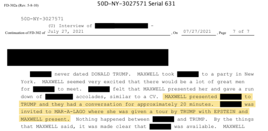 „Poznajem Jeffa 15 godina. Sjajan momak“, rekao je Trump za New York magazin o Epsteinovom profilu iz 2002. godine. „Veoma je zabavno biti u njegovom društvu. Čak kažu da voli lijepe žene koliko i ja, a mnoge od njih su mlađe.“ „Nema sumnje u to, Jeffrey uživa u svom društvenom životu.“