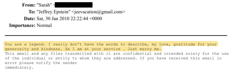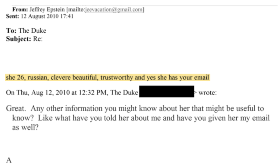 U e-poruci s računa za koji se vjeruje da pripada financijeru piše: „Mislim da Fergie sada može reći da nisam pedofil.“ U drugoj e-poruci iz aprila 2009. godine pojavljuje se zahtjev za sastanak s Epsteinom na „brzom čaju“, s frazama poput: „Dragi, izvanredni i posebni prijatelju Jeffrey. Ti si legenda i jako sam ponosan na tebe.“