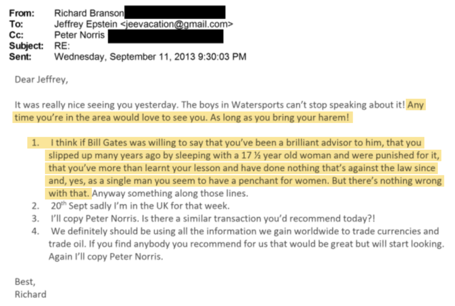 Ime Richarda Bransona se pojavljuje stotinama puta u dosijeu. U razmjeni poruka iz 2013. godine, Epstein zahvaljuje Bransonu na nedavnom gostoprimstvu i savjetima za odnose s javnošću; Branson odgovara da ga je "vrlo lijepo" vidjeti, dodajući: "Volio bih te vidjeti kad god budeš u blizini. Samo povedni svoj harem!"