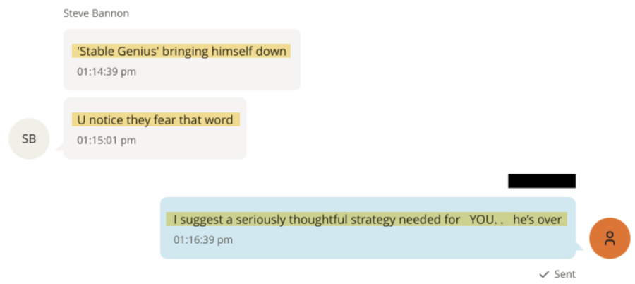 Datoteke također sadrže hiljade poruka koje su, izgleda, poslane između Epsteina i jednog od Trumpovih bivših glavnih savjetnika, Stevea Bannona. Većina poruka poslana je 2018. i 2019. godine, nakon što je Bannon napustio svoju ulogu u Bijeloj kući tokom Trumpovog prvog mandata, dok je pripremao film o Epsteinu prije njegove smrti.
