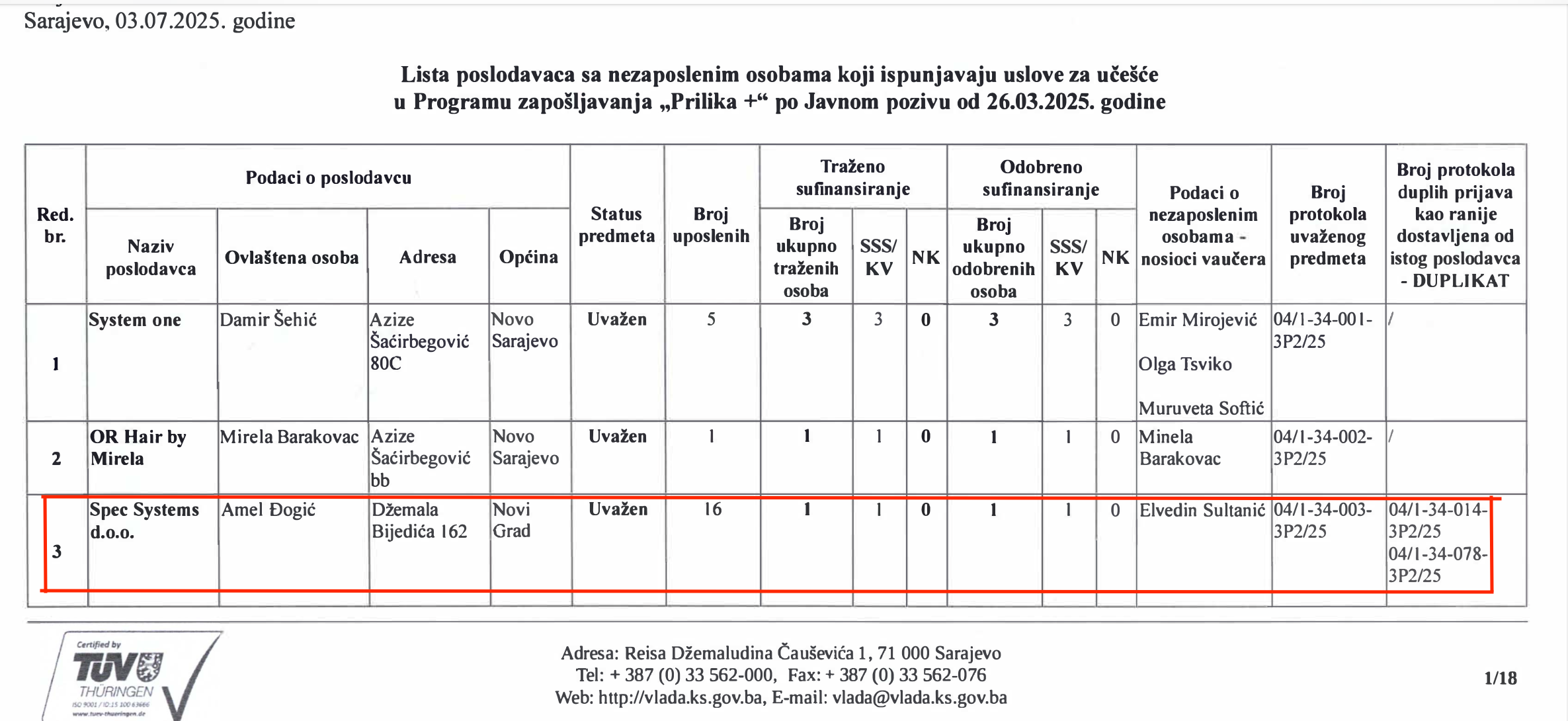 Pod rednim brojem tri je kompanija Spec Systems. U dokumentu Vlade KS je navedeno da je odgovorno lice u toj firmi Amel Đogić. Firma ima 16 zaposlenih, a odobreno joj je zapošljavanje još jednog radnika na teret Budžeta Kantona Sarajevo.