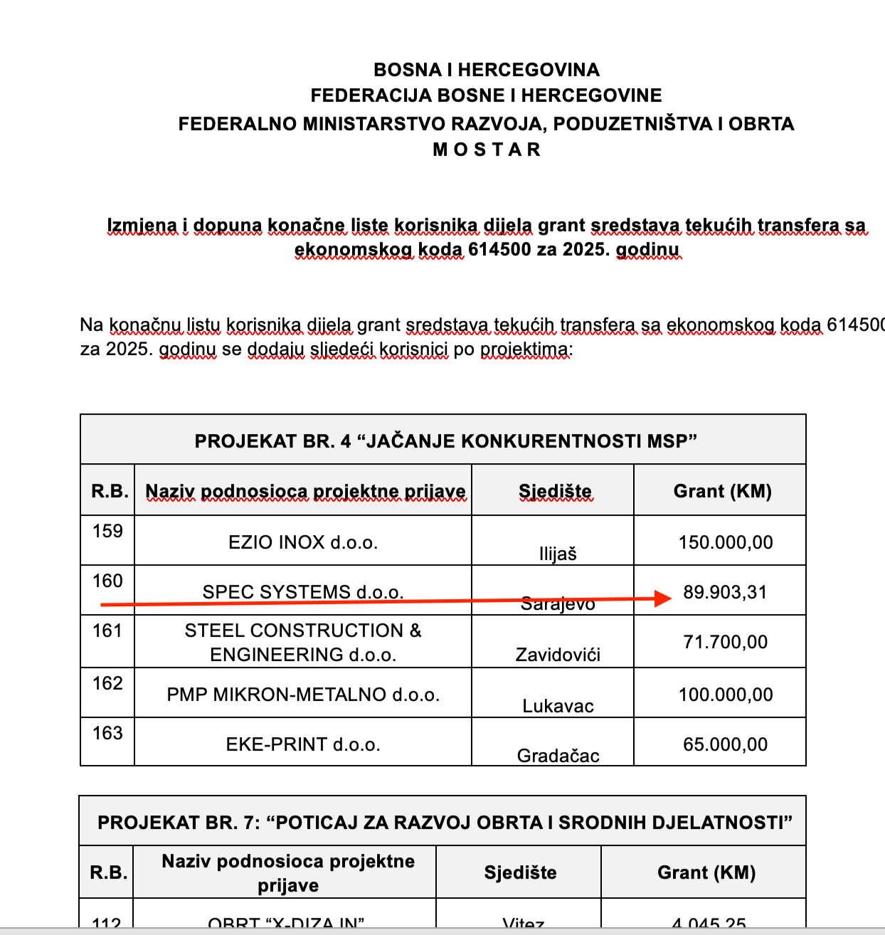 Privatna kompanija Spec Systems d.o.o Sarajevo, koja je u stvarnom, ali ne i u formalnom vlasništu Aljoše Čampare, kantonalnog zastupnika i federalnog delegata, dobila je od Federalnog ministarstva razvoja, poduzetništva i obrta skoro 90 hiljada maraka poticaja. Ministarstvo na čijem je čelu Vojin Mijatović dodijelilo je kompaniji Spec Systems 89.903,31 granta po osnovu projekta “jačanje konkurentnosti” za 2025. godinu.