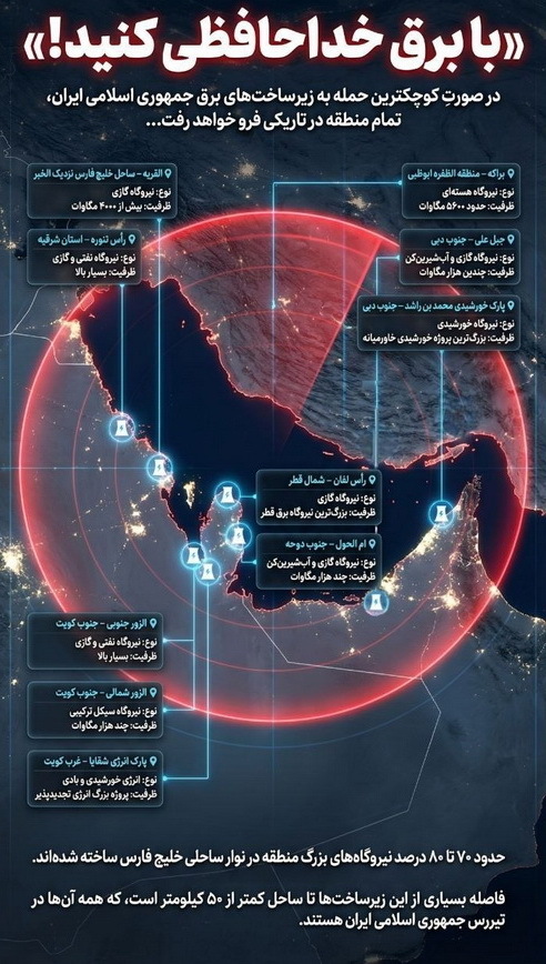 U tekstu na dnu grafike navodi se da se 70 do 80 posto velikih elektrana u regiji nalazi uz obalu Perzijskog zaljeva te da je velik dio te infrastrukture udaljen manje od 50 kilometara od mora, zbog čega je, kako se tvrdi, u dometu iranskih projektila.