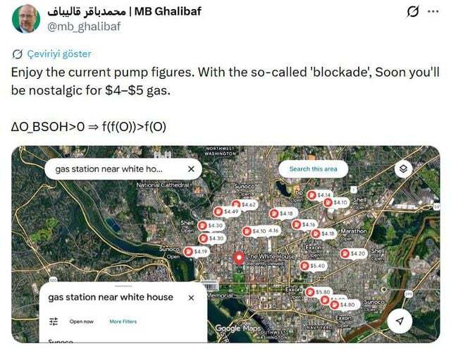 “Uživajte u cijenama koje trenutno vidite na pumpama. S ovom takozvanom ‘blokadom’, uskoro ćete žaliti za benzinom od 4-5 dolara”, poručio je Ghalibaf, uz objavu fotografije cijena goriva na benzinskim pumpama u blizini Bijela kuća.