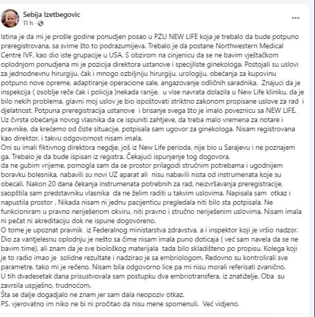 Sebija Izetbegović, zastupnica SDA u Skupštini Kantona Sarajevo, oglasila se na društvenim mrežama povodom krivične prijave koju je grupa pacijenata, oštećenih zatvaranjem Poliklinike Northwestern Medical Centre IVF u Sarajevu, podnijela Tužilaštvu KS.