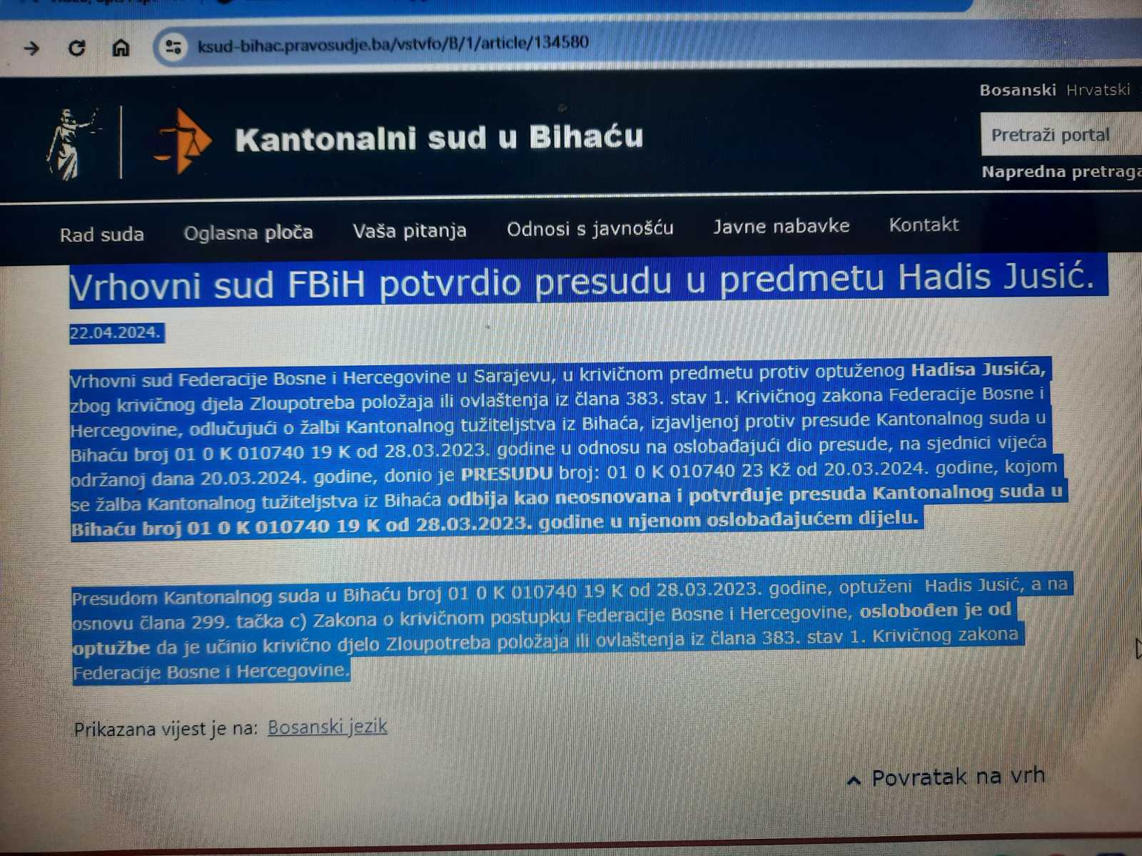 Na službenoj stranici Kantonalnog suda u Bihaću danas je objavljena informacija da je Vrhovni sud Federacije Bosne i Hercegovine u Sarajevu, u krivičnom predmetu protiv optuženog Hadisa Jusića, zbog krivičnog djela Zloupotreba položaja ili ovlaštenja iz člana 383. stav 1. Krivičnog zakona Federacije Bosne i Hercegovine, odbio žalbu Tužilaštva USK i oslobodio Jusića.
