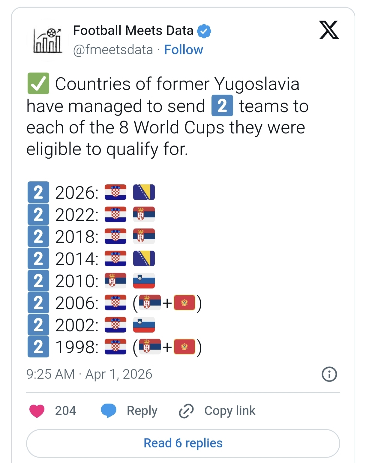 Države iz bivše Jugoslavije imaju posebnu tradiciju kada je u pitanju odlazak na Svjetsko prvenstvo, od 1998. godine pa do predstojećeg Mundijala u Sjedinjenim Američkim Državama, Kanadi i Meksiku. Naime, na svih osam svjetskih prvenstava bivša Jugoslavija "bila je zastupljena" s dvije svoje nekadašnje države.
