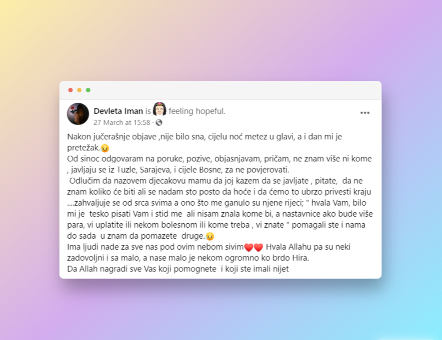 "Odlučim da nazovem dječakovu mamu da joj kažem da se javljate, pitate, da ne znam koliko će biti ali se nadam sto posto da hoće i da ćemo to ubrzo privesti kraju. Zahvaljuje se od srca svima, a ono što me ganulo su njene riječi: 'Hvala Vam, bilo mi je teško pisati Vam i stid me, ali nisam znala kome bi, a nastavnice ako bude više para, vi uplatite ili nekom bolesnom ili kome treba, vi znate. Pomagali ste i nama do sada i znam da pomažete druge'.