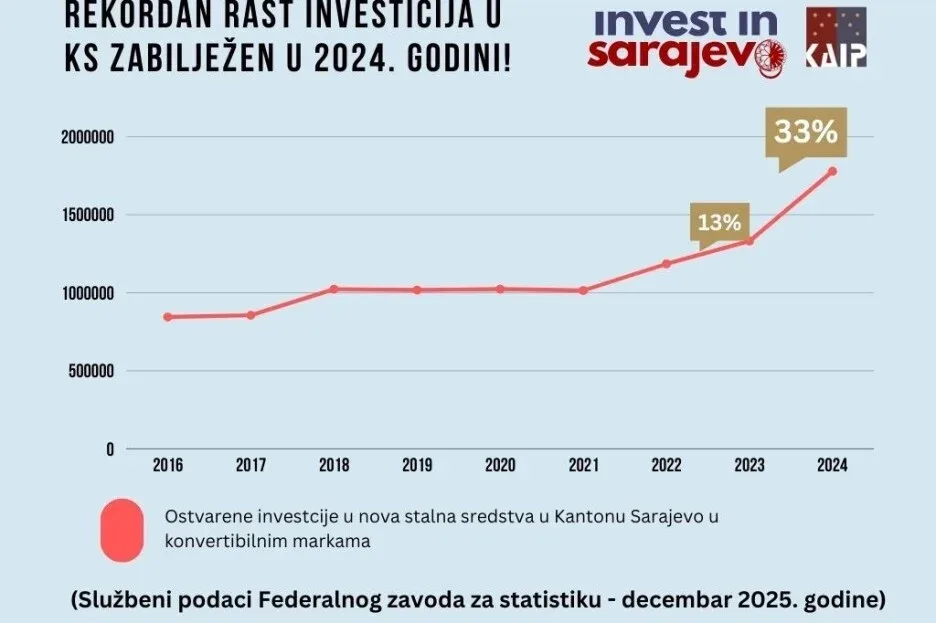 Kanton Sarajevo bilježi rekordan rast novih investicija, potvrdio je Adnan Jašarević, direktor Kantonalne agencije za privlačenje investicija i privatizaciju (KAIP).