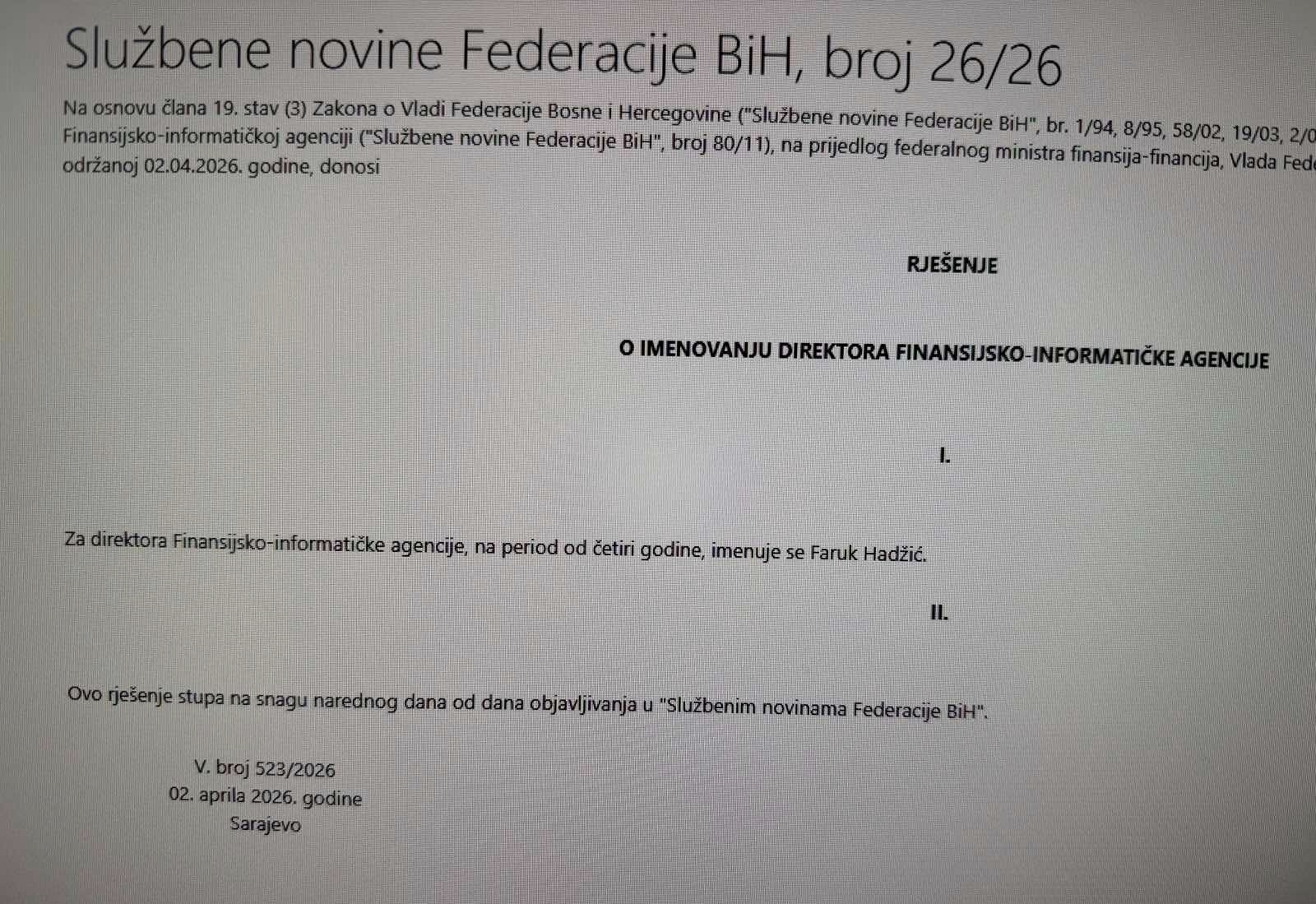Nakon mjeseci špekulacija, političkih pritisaka i zakulisnih pregovora, ono što je etto.ba najavio sada je dobilo i zvaničnu potvrdu – Faruk Hadžić imenovan je za novog direktora Finansijsko-informatičke agencije (FIA).