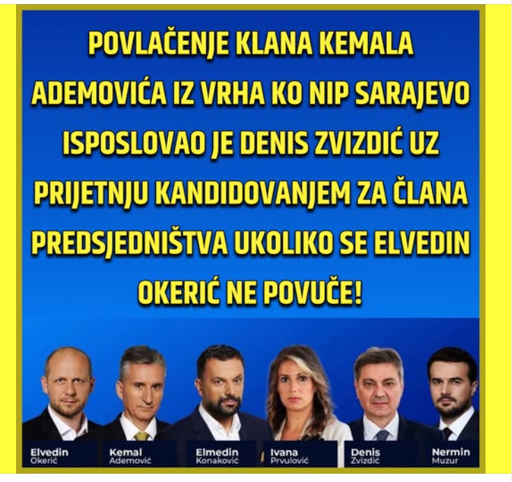Ključnu ulogu u ovom zapletu odigrao je Denis Zvizdić, koji je postavio ultimatum: ili Okerić napušta čelo KO, ili se on sam kandiduje za člana Predsjedništva BiH. Upravo sama pomisao na Zvizdićevu kandidaturu izazvala je ozbiljne napetosti među NiP-ovcima i onima koji stoje iza Dinovog rukovođenja strankom, jer bi takav razvoj događaja mogao kompromitovati kandidatsku prednost Denisa Bećirovića.