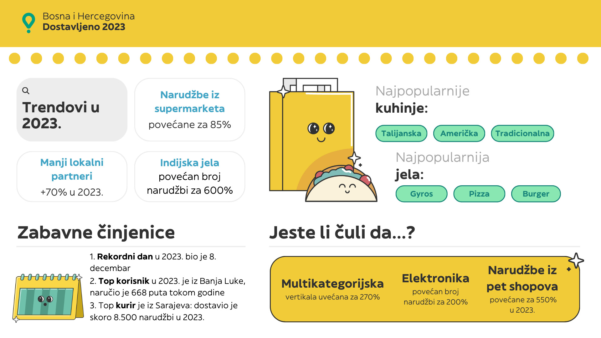 I u konačnici, Sarajevo, Banja Luka i Tuzla su bili najaktivniji gradovi u pogledu broja dostavljenih narudžbi. Međutim i drugi gradovi u Bosni i Hercegovini su zabilježili značajan rast narudžbi u 2023. godini. U Tuzli i Biljeljini je povećan broj dostavljenih narudžbi za više od 40% u odnosu na 2022. godinu..