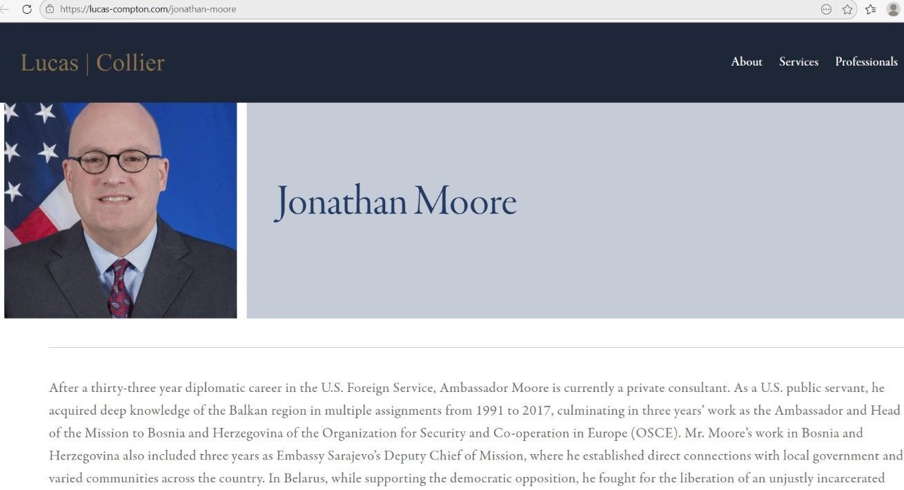 Zanimljivo je da se u timu te kompanije nalazi i Jonathan Moore, bivši šef Misije OSCE-a i nekadašnji zamjenik ambasadora SAD-a u Bosni i Hercegovini.