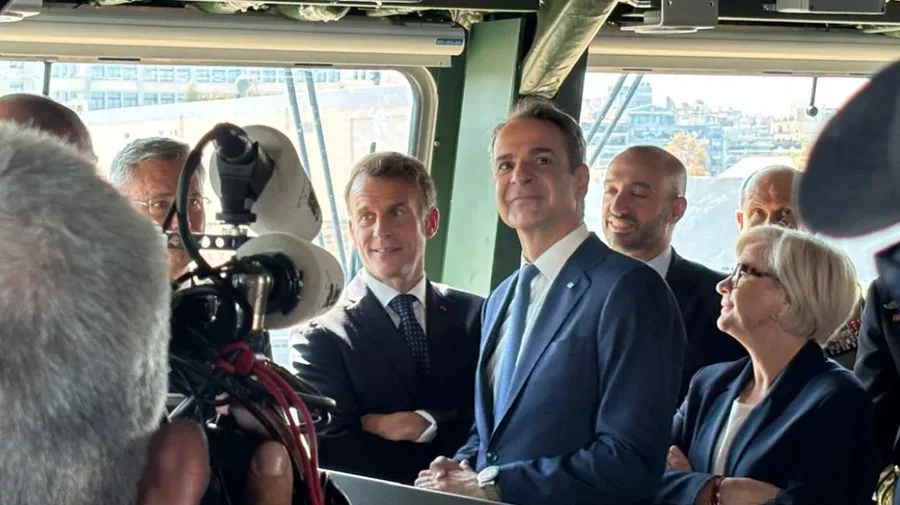 Grčki premijer i francuski predsjednik su u operativnoj sali dobili informacije od načelnika Generalštaba i komandanta flote o sposobnostima najsavremenijeg ratnog broda, najnaprednijeg u Mediteranu, a zatim su otišli na most Kimon.
