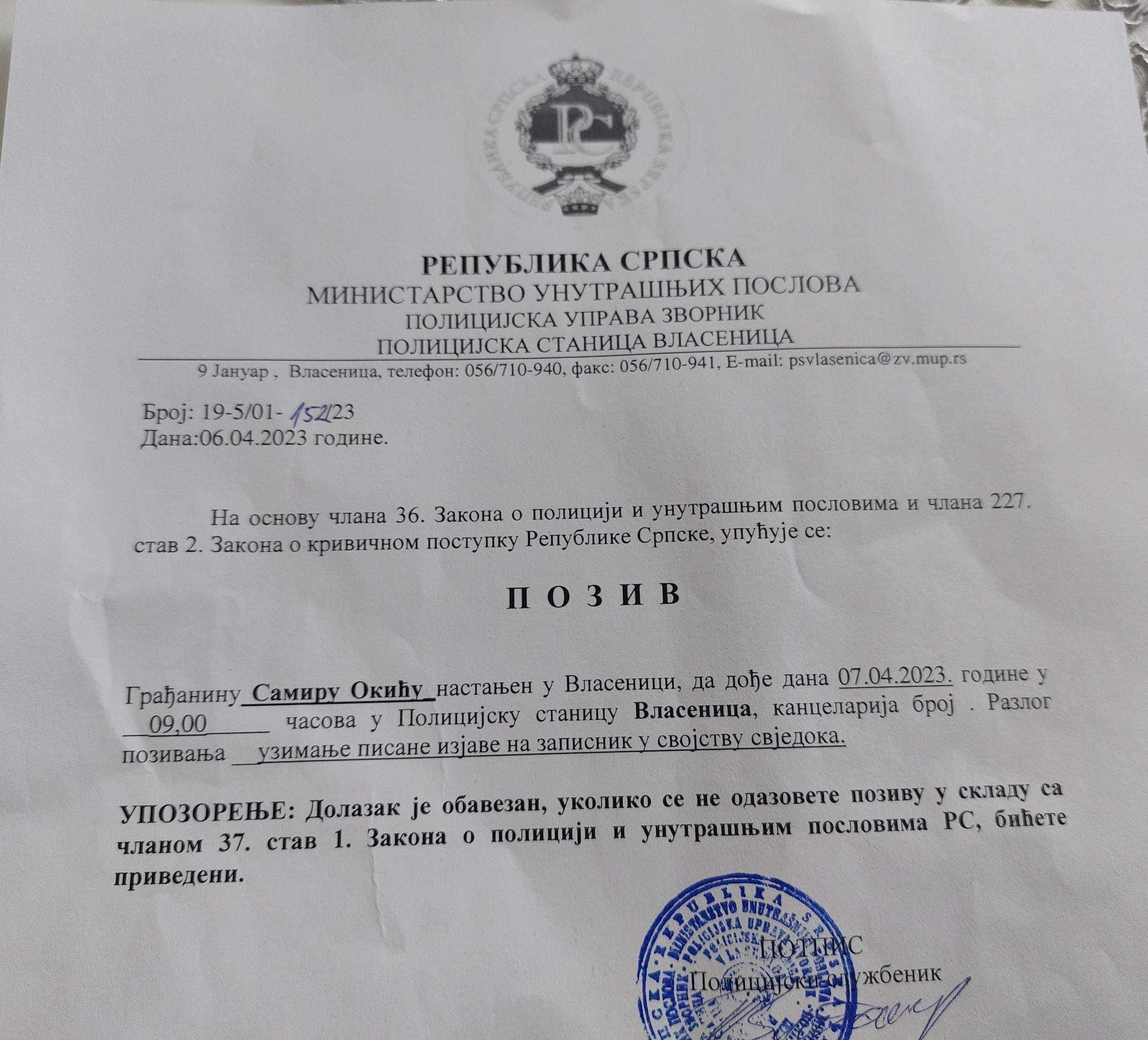 Naime, Okić je dobio poziv da da izjavu u Policijskoj stanici Vlasenica pod prijetnjama da će, ukoliko se ne odazove na poziv, biti priveden.