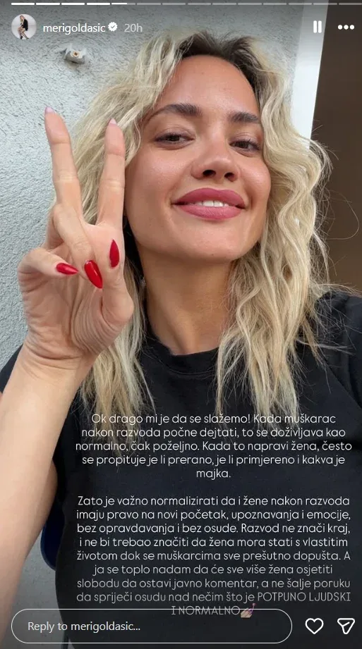 "Zato je važno normalizirati da i žene nakon razvoda imaju pravo na novi početak, upoznavanja i emocije, bez opravdavanja i bez osude. Razvod ne znači kraj i ne bi trebao značiti da žena mora stati s vlastitim životom dok se muškarcima sve prešutno dopušta. A ja se toplo nadam da će sve više žena osjetiti slobodu da ostavi javni komentar, a ne šalje poruku kako bi spriječila osudu nad nečim što je potpuno ljudski i normalno", poručila je.