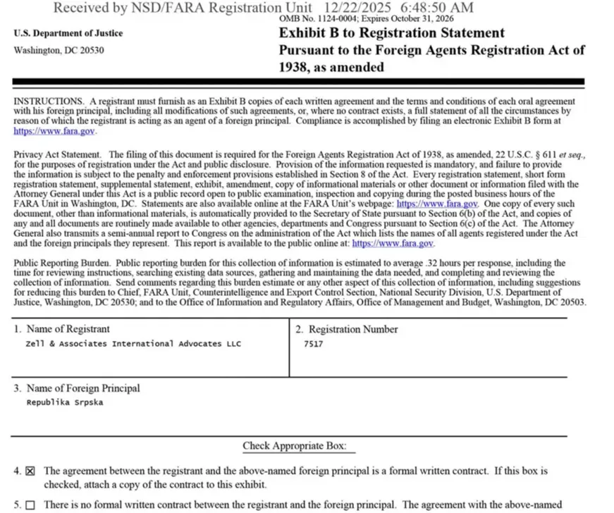 Republika Srpska, manjim bh. entitetom koji vodi Milorad Dodik, nastavlja s aktivnostima lobiranja u Sjedinjenim Američkim Državama, čime potvrđuje da strateški pristup Washingtonu ostaje ključni instrument političkog manevra i međunarodnog pritiska. Nepuna četiri dana nakon usvajanja Zakona o demokratiji i prosperitetu Zapadnog Balkana u Kongresu SAD-a, američko Ministarstvo pravde zabilježilo je aneks ugovora koji je RS potpisala s lobističkom kućom Zell & Associates.