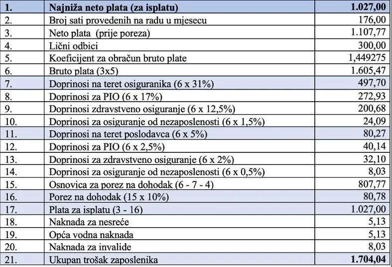 Ukupni trošak poslodavca po radniku na minimalnoj plati iznosi 1.704,04 KM.