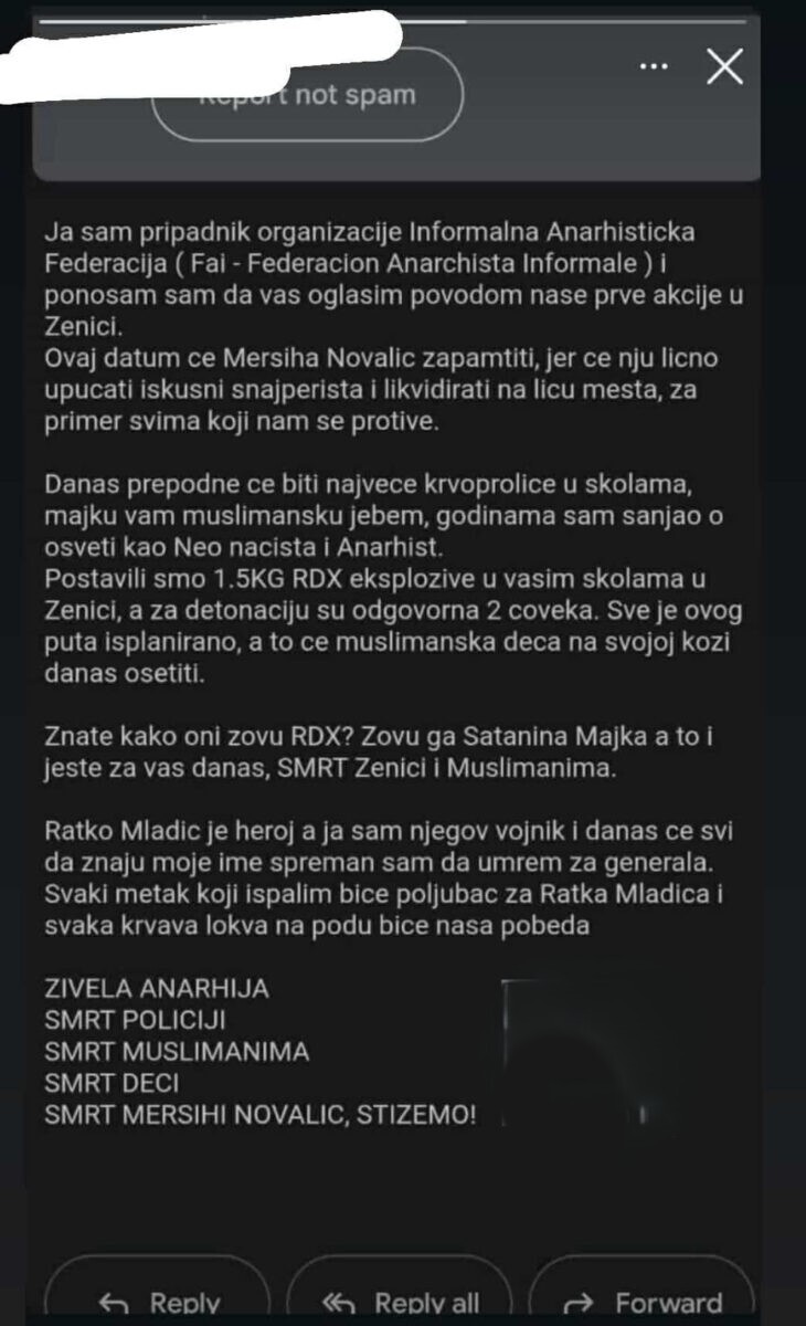 U današnjem anonimnom e-mailu koji je poslan na adrese institucija u ZDK je ponovo zaprijećeno državi Bosni, muslimanima, ali i portparolki Ministarstva unutrašnjih poslova Kantona Sarajevo Mersihi Novalić.