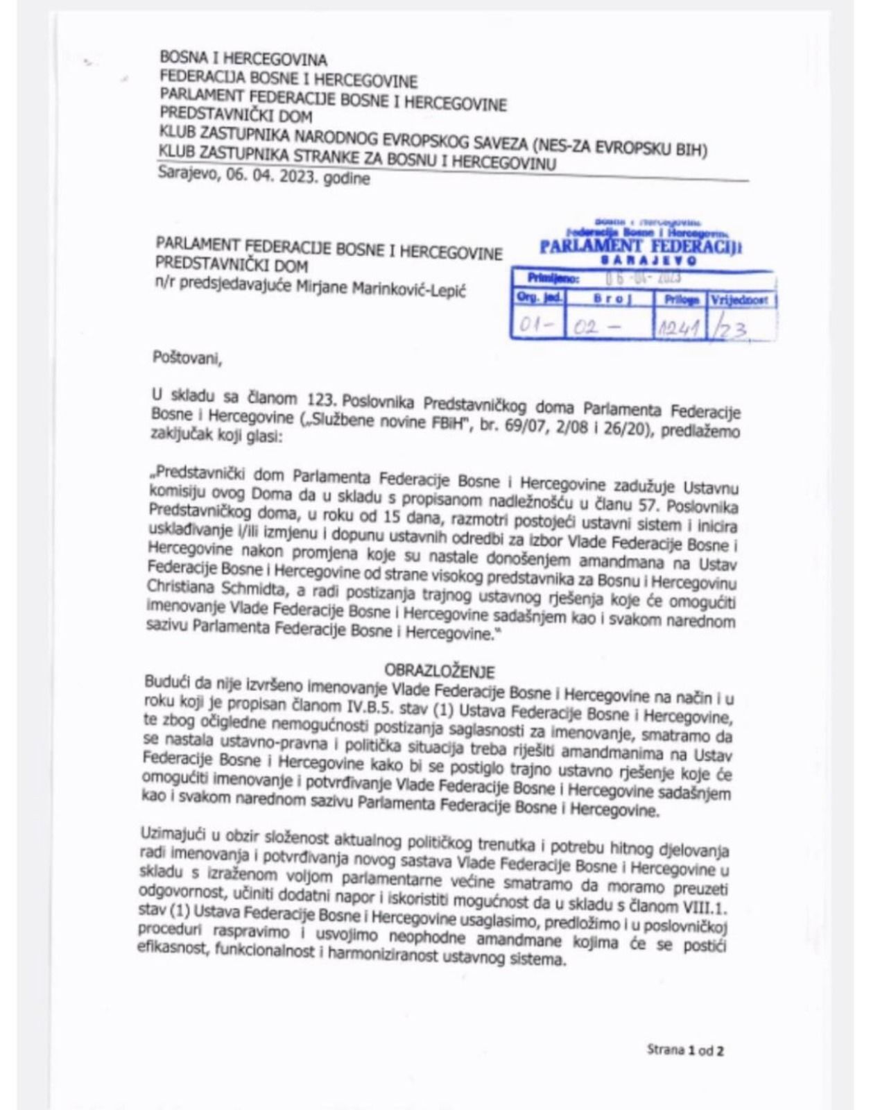 "Predstavnički dom Parlamenta Federacije Bosne i Hercegovine zadužuje Ustavnu komisiju ovog Doma da u skladu s propisanom nadležnošću u članu 57. Poslovnika Predstavničkog doma, u roku od 15 dana, razmotri postojeći ustavni sistem i inicira usklađivanje i/ili izmjenu i dopunu ustavnih odredbi za izbor Vlade FBiH, nakon promjena koje su nastale donošenjem amandmana na Ustav FBiH od strane visokog predstavnika za BiH Christiana Schmidta, a radi postizanja trajnog ustavnog rješenja koje će omogućiti implementaciju izbornih rezultata kroz imenovanje Vlade FBiH u propisanim rokovima, kako u sadašnjem tako i u svakom narednom sazivu Parlamenta FBiH".
