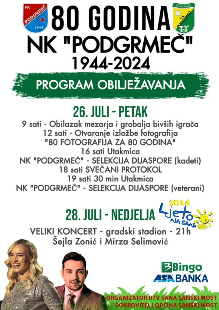 Pored pomenutiih utakmica, šlag na tortu za 80. rođendam Podgrmeča biće veliki koncert Šejle Zonić i Mirze Selimovića koji će se održati u nedjelju 28. jula na Gradskom stadionu sa početkom u 21 sat. Organizator svih događaja je RTV Sana pod pokroviteljstvom Općine Sanski Most.