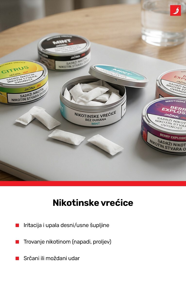 "Štetnost nikotinskih vrećica uključuje blage simptome, poput mučnine i povraćanja, proljeva, pojačanog slinjenja i usporenog rada srca, te razvoj ovisnosti. Teži simptomi uključuju povišen krvni pritisak i ubrzan rad srca, a teško trovanje može uzrokovati napade i poremećaje disanja", rekla je pedijatrica Polić.