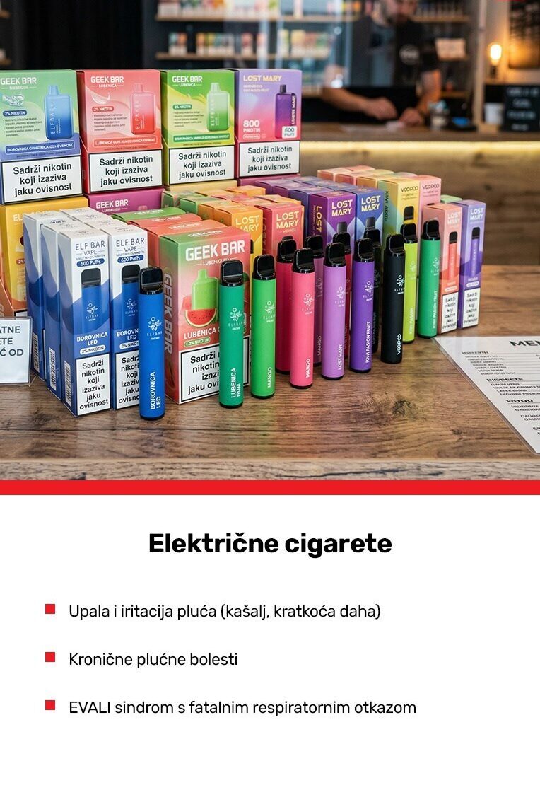 Elektronske cigarete nisu bezopasna alternativa pušenju kako ih proizvođači često reklamiraju. Sadrže nikotin i hemijske spojeve koji mogu negativno utjecati na respiratorni trakt i dugoročno zdravlje.