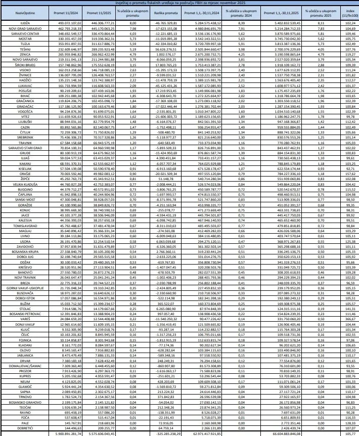 Najveći dio fiskalnog prometa i dalje se ostvaruje u Sarajevu, koje je u novembru imalo oko 1,35 milijardi KM fiskalnog prometa. Ipak, i glavni grad bilježi pad u odnosu na prošlu godinu, što je jasan signal da ni najveća tržišta nisu imuna na usporavanje.