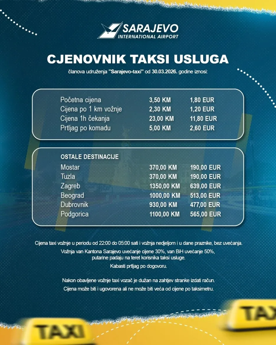 Međunarodni aerodrom Sarajevo objavio je novi cjenovnik usluga Sarajevo taxija, koji se odnosi na prijevoz putnika od aerodroma prema gradu i drugim destinacijama.