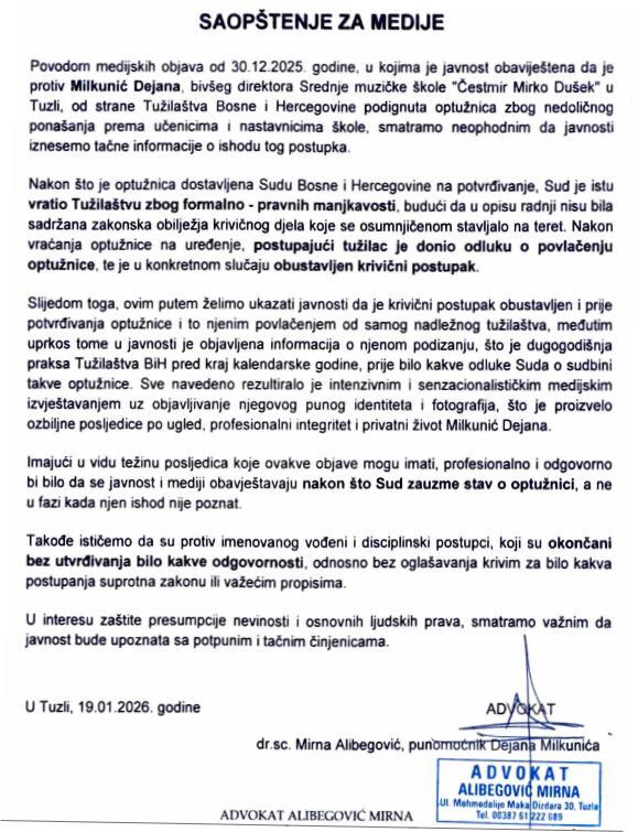 Advokatica Mirna Alibegović oglasila se nakon medijskih objava od 30. decembra prošle godine, u kojima je javnost obaviještena da je protiv Dejana Milkunića, bivšeg direktora Srednje muzičke škole "Čestmir Mirko Dušek" u Tuzli, od strane Tužilaštva Bosne i Hercegovine podignuta optužnica zbog nedoličnog ponašanja prema učenicima i nastavnicima škole.