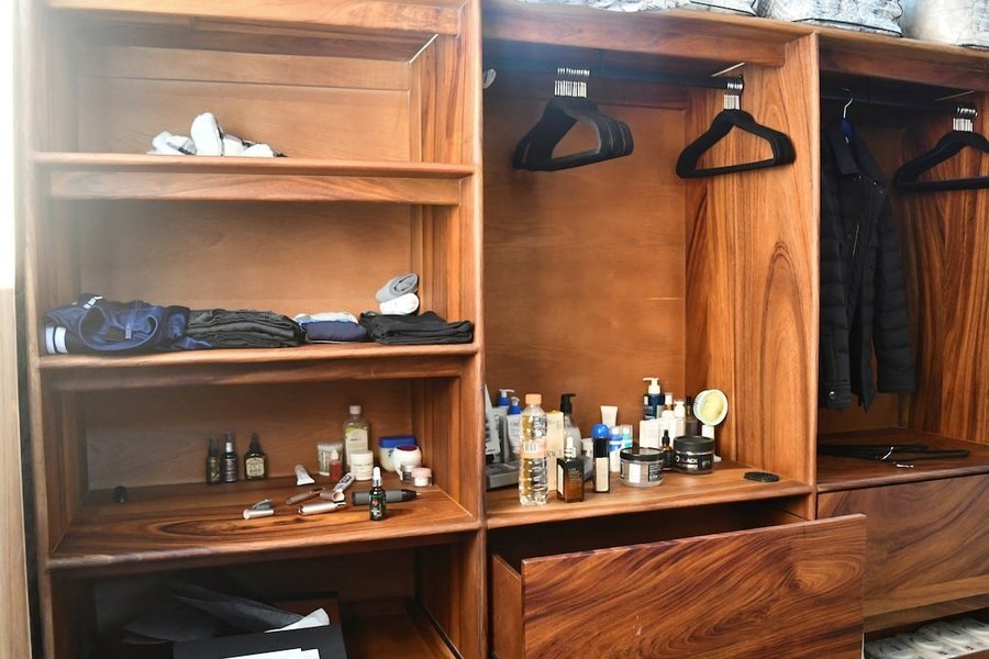 Ormar u velikoj spavaćoj sobi sadržavao je uredno složenu odjeću i red proizvoda za njegu kože i parfema na polici. U donjoj ladici nalazilo se nekoliko kutija dječjih vlažnih maramica.