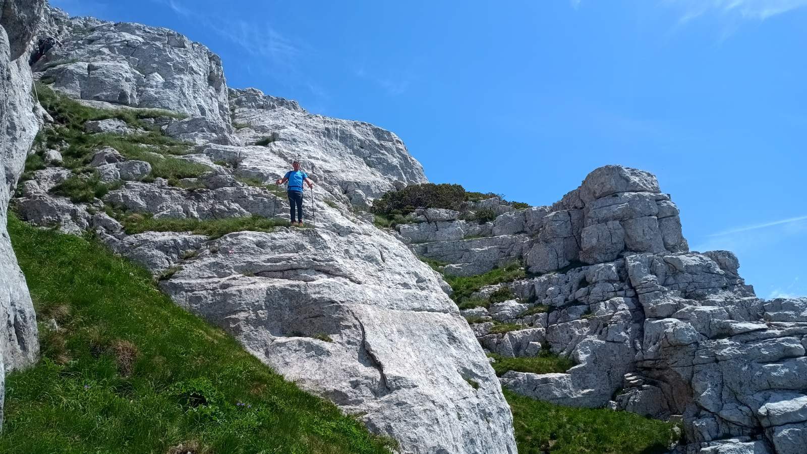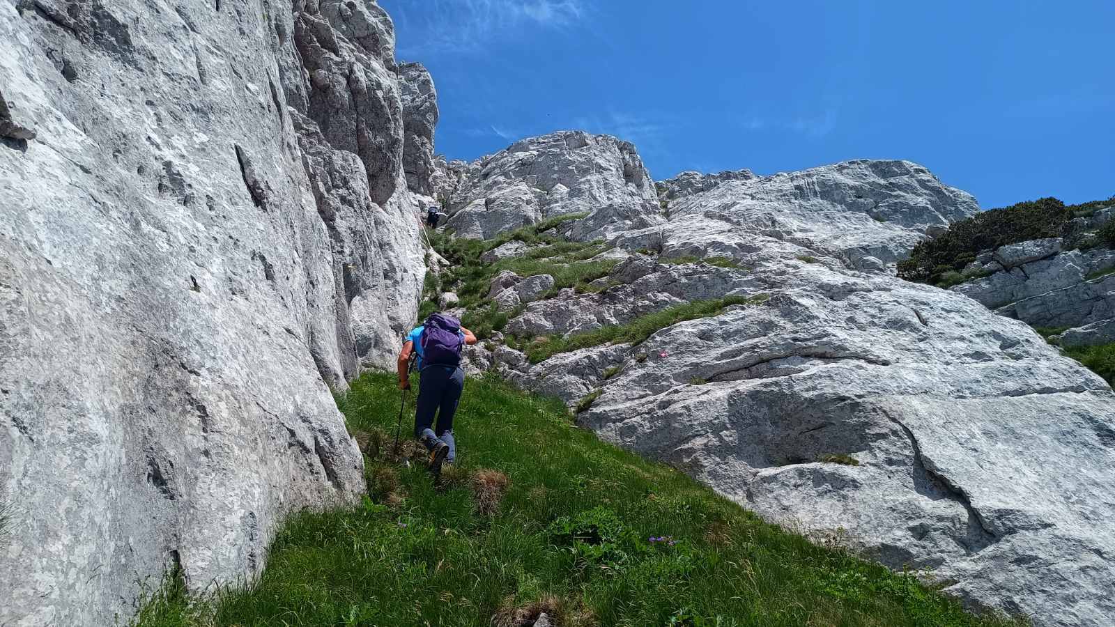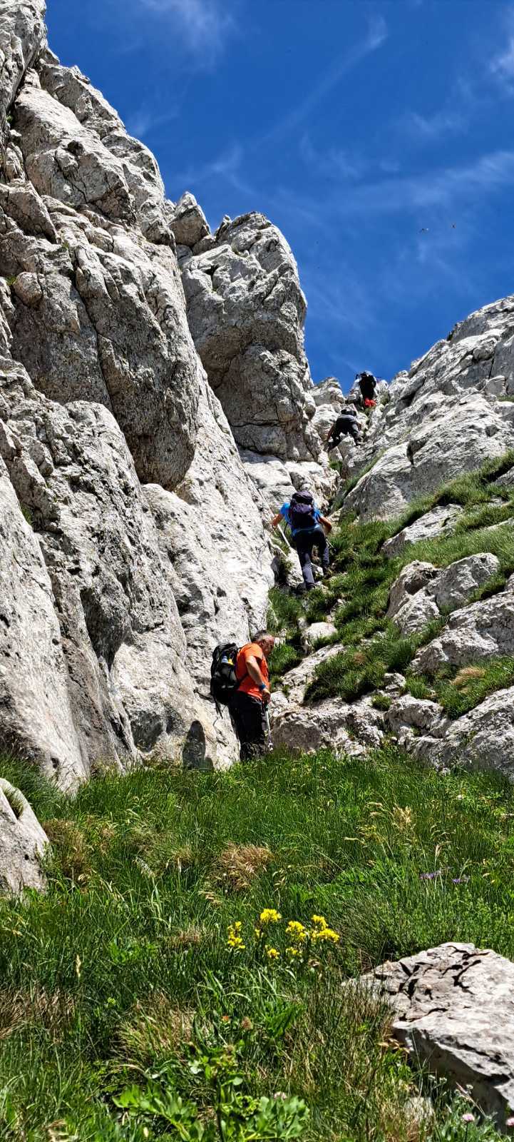 Kada se pređe livada, slijedi najopasniji dio puta, a to je pentranje uz stijene. Postoje dvije staze, jedna lakša i duža koja vijuga između stijena i ona teža, gdje postoji sajla koja olakšava okomito penjanje uz liticu, s tim da se ipak mora upotrijebiti veća fizička snaga, pa se ne preporučuje slabijim planinarima- objašnjava Šadić.